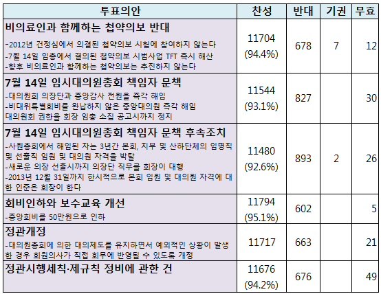 투표 결과는 압도적이었다. 6개 안건 모두 한의협이 마련한 항목에 '찬성표'를 90% 이상 던졌다.
