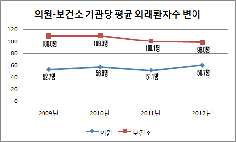 의원 또한 2010년 56.6명에서 2011년 51.1명까지 줄었다가 2012년에는 59.7명으로 다시 올라섰다. 2009년에 외래환자 수가 52.7명이었던 점을 감안하면 전체적으로 환자 수가 줄어들었던 2011년을 제외하면 증가경향을 보이고 있다.