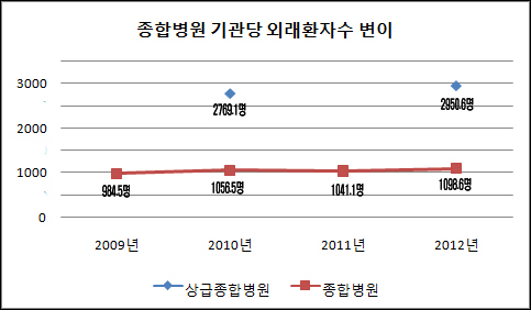 이 같은 변화는 의료기관 종별 외래환자 수에도 그대로 반영됐다. 실제 종합병원급 이상 의료기관의 경우 2010년 1056.5명에서 201년 1041.1명까지 줄었다가 2012년에는 1098.6명까지 증가했다.