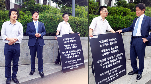 5일 복지부 앞 1인 시위에 참여한 전라북도 군산 이모 원장(봉직의)을 격려하기 위해 노환규 의협회장이 복지부를 찾았다.