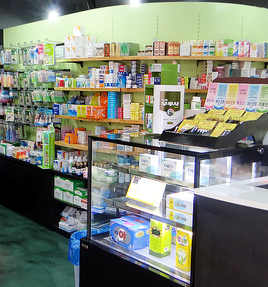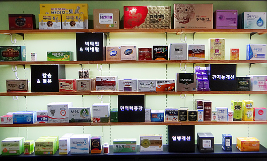 건강기능식품 진열대는 환자들이 가만히 서서 같은 종류의 제품을 위, 아래로 살펴보는 세로형 선반은 지양하고 가로형을 선택하면서 이동하면서 같은 종류의 제품을 살펴보도록 동선을 그렸다.