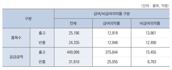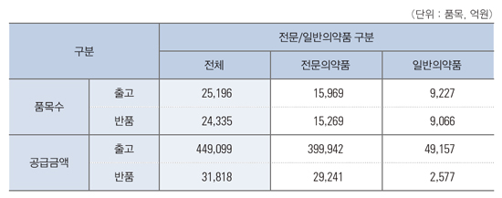 품목수 기준으로는 급여의약품은 1만2918개가 출고됐는 데, 반품 품목수는 1만2948개로 30개가 더 많았다.