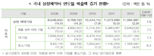 ◆제약산업의 체질개선=국내 제약기업의 경영실적을 분석해 본 결과, 국내 상장제약사의 2012년 총매출은 약가인하에도 불구하고 전년대비 2.9% 증가한 것으로 나타났다. 특히 중소기업의 증가율(4.5%)은 전체기업 증가율을 상회했다.