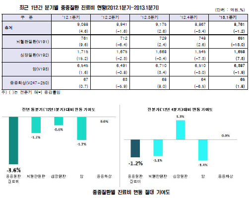 뇌혈관 질환이 한 분기동안 가장 많이 줄었는 데, 진료비가 늘어난 심장질환에 비해 큰 폭으로 줄어들어 전체적인 감소세를 견인했다.