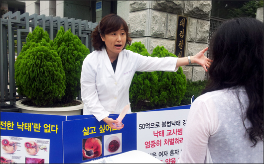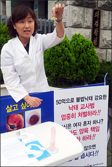 지난달 26일 대전지법 제3형사부(부장판사 정완)가 405명의 태아살해 혐의로 기소된 의사들에 대한 검사 항소를 기각하고 선고유예와 형 면제 판결을 내리자 대전으로 내려가 법원 앞에서 1인 시위를 시작했다.