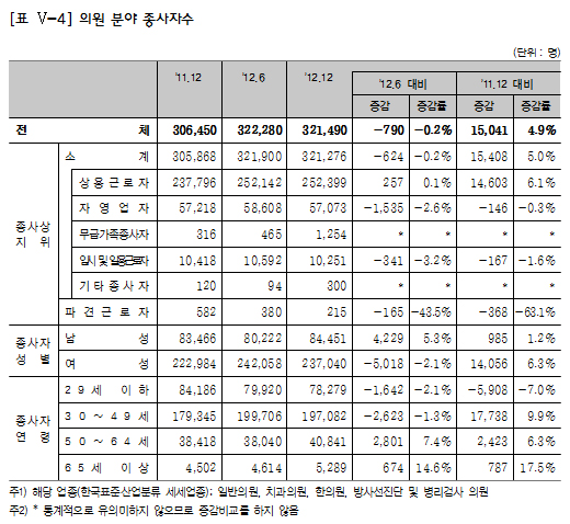 의원은 32만1490명이 근무하고 있었다. 2011년 12월 말과 비교하면 4.9% 늘어난 수치다. 반면 지난해 6월 대비로는 0.2% 감소한 것으로 조사됐다.