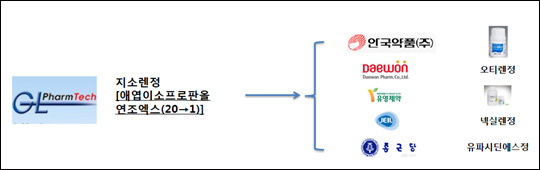 지엘팜텍은 스티렌 개량신약인 지소렌정을 개발하고 종근당, 제일약품, 안국약품, 대원제약, 유영제약 등 5곳과 코마케팅을 전개하고 있다.