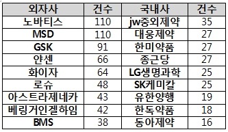 제약사별 건수를 보면 신약을 다수 보유한 다국적제약사들이 상위권에 올랐다.