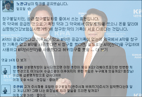또한 청구불일치를 두고 노 회장과 조 회장이 SNS 설전을 벌인 것과 관련, 송 대변인은 "심평원이 청구불일치 관련 자료를 내놓지 않기 때문에 벌어지는 것"이라며 "잘못한 일은 시인할 수 있도록 정확한 자료를 발표해야 한다"고 강조했다.