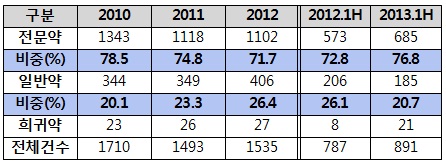 2010년 전문약 허가는 1343건, 2011년 1118건, 2012년 1102건으로 지속적인 감소경향을 보였다.