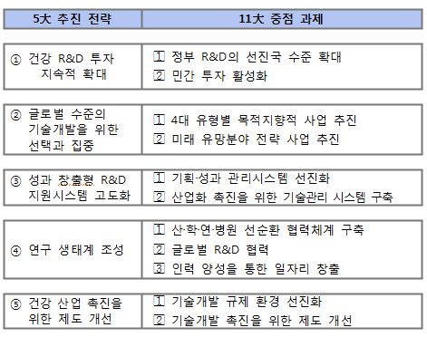 또 지원이 적기에 가능하도록 5대 추진전략을 세웠다. 추진 전략은 건강 R&D 투자 지속 확대와 글로벌 수준의 기술개발을 위한 선택과 집중, 성과 창출형 R&D 지원 시스템 고도화, 연구 생태계 조성, 건강산업 촉진을 위한 제도 개선 등이다.