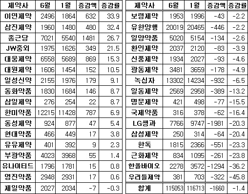 - 제약 상반기 주가 1월 대비 1.4% 하락…종근당·삼진 등 선전