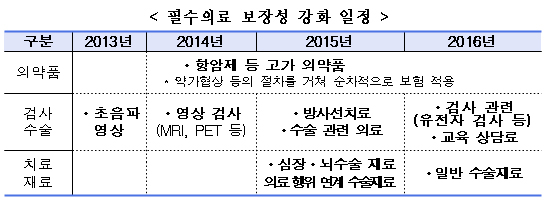 연도별로는 ▲2013년 10월 초음파 영상진단 ▲2014년 항암제, 희귀난치질환 치료제 등 고가약제와 MRI 등 영상검사 ▲2015년 고가의 수술, 방사선치료 등에 적용되는 의료행위, 수술재료 ▲2016년 치료방법 결정을 위해 필요한 유전자 검사, 암 환자 등의 교육상담 등의 순으로 보장성을 확대해 나간다.