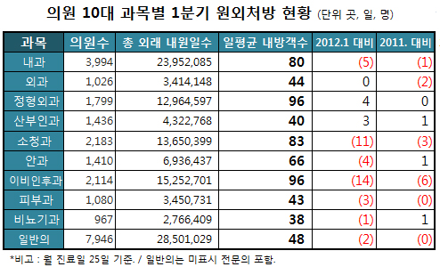 내과와 안과, 피부과와 일반의 등에 방문하는 환자들도 하루 평균 최대 5명 가량 줄어드는 경향이 포착됐다. 2011년 같은 시기와 비교해보면 과목별 증가세가 감소세로 뚜렷하게 반전했다.