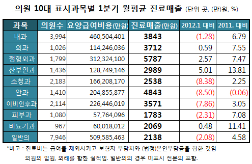 이는 내원일수 증감과 직접적으로 연관이 있다. 표시과목 전체의 하루 평균 내원일수를 살펴보면 2011년 1분기 평균 65명이었던 환자들은 이듬해인 2012년 1분기 평균 3명 더 늘어난 68일을 기록했다.