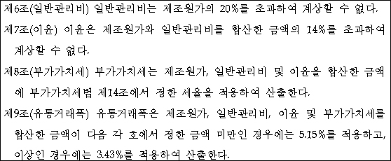 또한 원가산정기준에서의 적정 이윤은 제조원가와 일반관리비 합산금액의 14%까지, 일반관리비는 제조원가의 20%까지 인정하고 있다.