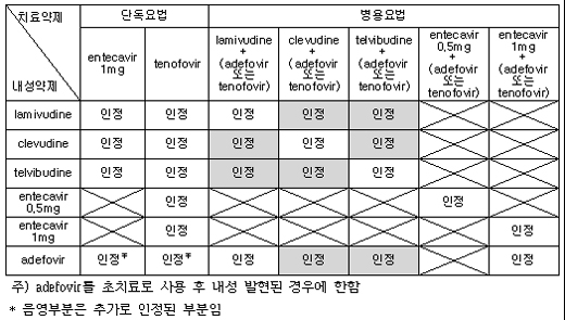 또 아데포비어를 초치료제로 사용한 뒤 내성이 발생하면 엔테카비어1mg과 테노포비어 단독요법에 각각 급여를 인정하기로 했다.