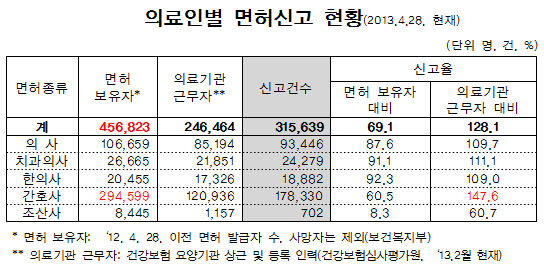 보건복지부는 의료인 면허신고제에 따라 지난해 4월 28일 이전에 면허를 받은 의사와 치과의사, 한의사, 간호사, 조산사에 대해 일괄신고 받은 결과를 분석해 7일 발표했다.