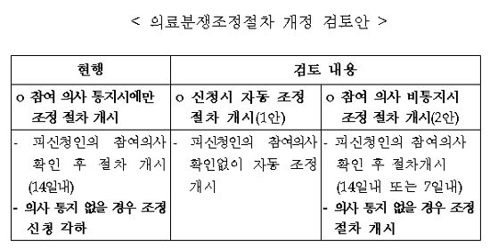 이와 관련 복지부는 "우선은 의료계가 자율적으로 참여할 수 있도록 독려하고, 피신청인의 조정참여 의무화에 대해서도 이해관계자의 의견수렴 결과 등을 검토해 법령 개정을 추진하도록 하겠다"고 답했다.
