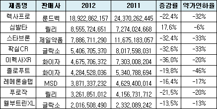 가장 큰 원인은 작년 시행된 약가인하 탓이다. 올해 판매처가 환인제약에서 제일약품으로 변경된 렉사프로와 GSK의 팍실CR은 작년 4월 일괄 약가인하로 각각 32%, 33% 약가가 인하됐다. 또 스타브론은 작년 8월 33% 약가가 떨어졌다.