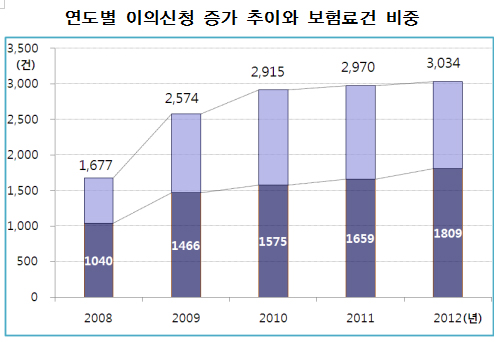 28일 현황에 따르면 지난해 이의신청 결정건수는 총 3034건으로 2011년 2970건보다 2.1% 늘었다.