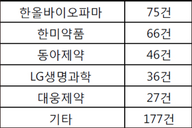 한미약품의 PCT특허출원수는 68건, 미국 특허출원수는 45건, 미국 특허등록수는 33건이었으며, 한올바이오파마는 PCT특허출원 55건, 미국 특허출원 26건, 미국 특허등록 14건을 기록했다.