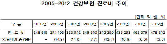 실제로 2006년부터 2010년까지 진료비는 2008년을 빼고 연평균 10% 이상 증가율을 보였지만 2011년과 2012년에는 각각 6%, 3.5% 증가율에 그쳤다.