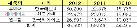 18일 건강보험심사평가원이 작성한 2012년 의약품 청구액 현황자료에 따르면 작년 류마티스관절염을 적응증을 하는 TNA-알파 억제제 가운데 휴미라는 303억원의 청구액으로 290억의 레미케이드를 앞섰다.