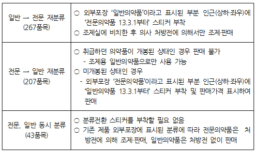 전문에서 일반약으로 전환되는 207품목은 개봉된 상태에서 판매하면 안된다. 조제용 일반약으로만 사용가능하다.