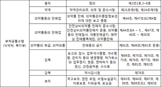 또 약국 관리의무와 준수사항, 의약품 판매와 의약품관리종합정보센터 보고 명령, 안전상비의약품 판매자 준수사항, 의약품 등의 판매질서, 개봉판매금지, 약사감시원, 허가취소와 업무정지, 과징금처분 등은 두 부처가 함께 수행한다.