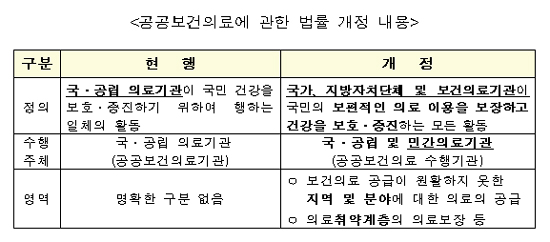 공공보건의료의 범위를 '국공립병원 등 공공보건의료기관이 제공하는 서비스'로 한정했던 것을 '민간의료기관에 의해 제공되는 공익적 보건의료서비스'로 확대하는 내용이 주요 골자다. 그동안 정부는 국공립병원을 중심으로 공공보건의료 기능을 수행하도록 하고 지원해 왔다. 하지만 민간의료기관이 전체 의료기관 중 대부분을 차지하고 있는 국내 보건의료 체계를 감안할 때 보건의료 자원의 효율적 활용을 저해한다는 지적이 제기돼 왔다.