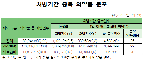 30일 심평원 보도자료에 따르면 2011년 한 해 동안 의료기관에서 처방전을 두 번 이상 발급받은 환자 중 10%를 무작위 추출해 분석했더니 전체 처방전의 0.9%에서 중복처방된 동일효능군 내 의약품이 확인됐다.