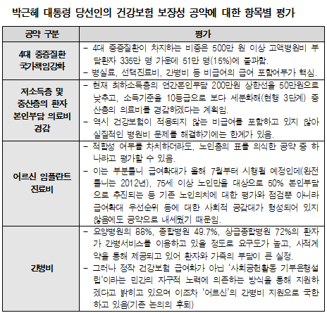 평가 결과에 따르면 박 당선인의 공약은 전체 목표보장성 계획이 없고, 선별적으로 일부 항목별 급여확대 접근방식을 취하고 있다는 점에서 이명박 정부와 크게 다를 바 없다.