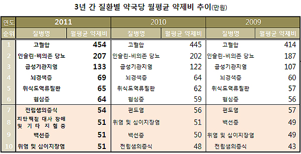 인슐린-비의존 당뇨와 급성기관지염, 뇌경색증, 위식도역류질환, 협심증 질환등도 월평균 약제비가 상대적으로 높았다.