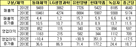 7일 한화투자증권은 주요 상위 제약사의 2013년 예상 매출 성장률은 12%, 영업이익은 41.2% 증가할 것으로 추정했다.