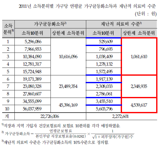 연구진은 공단 DB를 이용해 2011년 수진기준 1493만8079가구 3676만8193명을 대상으로 분석한 결과, 소득분위 1~5등급 구간은 106만1610원의 상한제 소득분위가 도출됐으며, 6~8등급은 234만8935원, 9~10등급은 453만9617원으로 나왔다.