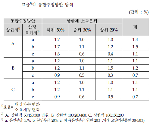상한제는 소득구간 하위 50%, 중위 30%, 상위 20%를 유지하면서도 재난적 의료비 추정 결과를 근거로 금액을 수정하는 방안이다.