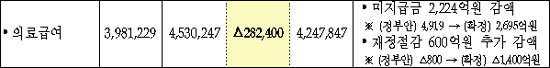 복지부 맹호영 기초의료보장과장은 "국채를 발행하지 않고 국가재정 계획을 세우다보니 금액이 크고 상대적으로 덜 시급한 건강보험과 의료급여 국고지원에서 일부 감액이 이뤄진 것으로 보인다"고 말했다.