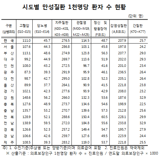 또 치주질환은 대전(295명), 관절염은 전남(184.8명), 정신 및 행동장애는 전북(60.5명), 감염성질환은 광주(236.5명), 간질환은 강원과 전남(32.9명)이 1위를 차지했다.