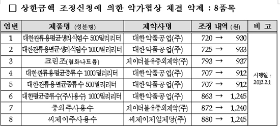 이에 반해 상한금액 조정신청에 의해 약가협상이 체결된 주사용제 8개 품목은 내년 2월부터 약값이 인상된다.