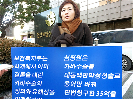 1인시위에 나선 고 길정진 씨의 딸 길윤진 씨는 "복지부의 고시 폐지 조치에도 불구하고 여전히 건대병원과 송 교수는 외래 환자를 계속해서 받고 있다"며 "이름만 바꿨다고 급여를 지급한다면 아버지와 같은 또 다른 피해자가 속출할 것"이라며, 전면 급여중단을 재차 촉구했다.