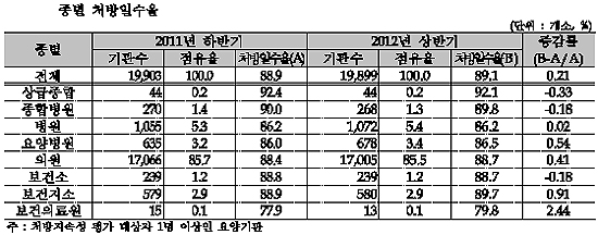 처방일수율은 보건의료원을 제외한 모든 종별에서 80% 이상을 보였고 상급종병이 92.1%로 가장 높았고, 종병 89.8%, 병원 86.2%로 나타났다.