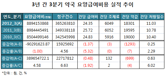 건강보험심사평가원(원장 강윤구)이 최근 공개한 '2012년도 3분기 진료비통계지표'를 바탕으로 데일리팜이 최근 3년 간 3분기 항목별 약국 요양급여비용 실적을 비교, 분석한 결과 이 같은 경향이 포착됐다.