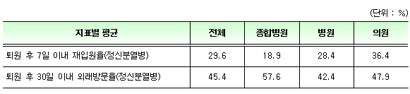 이와 함께 정신분열병 퇴원 후 7일 이내 재입원율은 평균 29.6%로 종합병원의 비율이 가장 낮은 것으로 분석됐다.