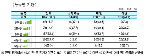 반면 시립용인정신병원 등 140개 기관은 4~5등급으로 낮은 평가를 받았다. 특히 1차 평가에서 5등급을 받은 68개 기관 중 13개 기관은 이번에도 5등급을 받았다.
