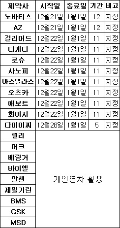 이 밖에 릴리, 머크, 베링거인겔하임, 바이엘, 얀센, 제일기린, BMS, GSK, MSD 등 9개 제약사들은 자율 연차사용을 통해 각각 연말 휴무를 갖게 된다.