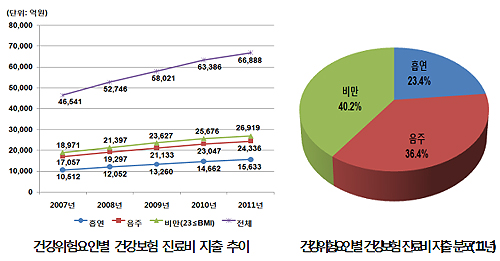 건강위험요인으로 인한 건보 진료비 지출액 중 비만 치료에 쓰인 비용은 40.2% 비중으로 가장 컸다. 다음으로 음주가 36.4%, 흡연 23.4% 순으로 지출 비중이 높았다. 관련 지출 규모를 살펴보면 흡연의 경우 2007년 1조512억원에서 5년 새 2011년 1조5633억원으로 무려 48.7% 늘었다.
