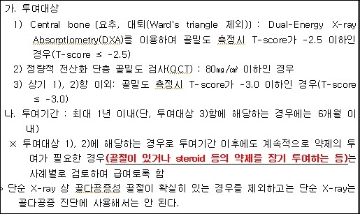 한편 복지부는 골밀도 검사상 T점수가 -2.5이하부터 급여를 인정하고 투여기간을 1년으로의 연장하는 급여확대 개정안을 지난해 10월부터 시행했다.