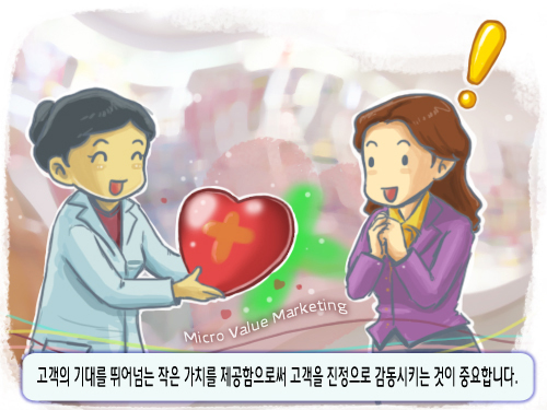 고객만족서비스를 높이는데 큰 도움이 되는 새로운 마케팅 방법론으로 작은 것으로 승부를 보는 마이크로 밸류 마케팅(Micro Value Marketing)이 있는데 큰 돈 들이지 않고 약국에 도입하여 효과를 볼 수 있습니다. 이제 마케팅은 기술의 차이가 거의 없어짐에 따라 본원적인 품질 경쟁이 아니라 매우 작은 가치의 차별화 경쟁으로 변화하고 있습니다. 이것이 바로 마이크로 밸류 마케팅(Micro Value Marketing)입니다.