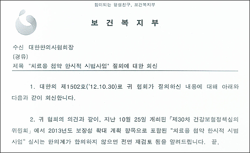 보건복지부 또한 한의계가 이번 시범사업에 합의하지 않으면, 사업 자체를 전면 재검토 하겠다는 뜻을 복지부장관 명의의 공문으로 밝히고 있다.